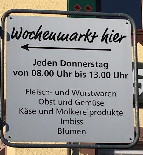 Der Wochenmarkt findet jeden Donnerstag von 8.00 Uhr bis 13.00 Uhr statt. Sie finden den Wochenmarkt auf dem Platz neben dem Reichenbach direkt an der Hauptdurchgangsstraße (Nähe Gasthaus Löwen).